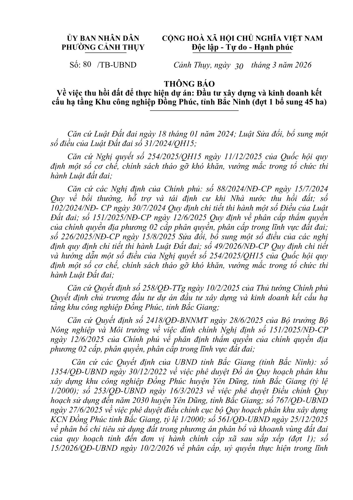 Thông báo thu hồi đất thực hiện dự án KCN Đồng Phúc (đợt 1 bổ sung 45 ha)