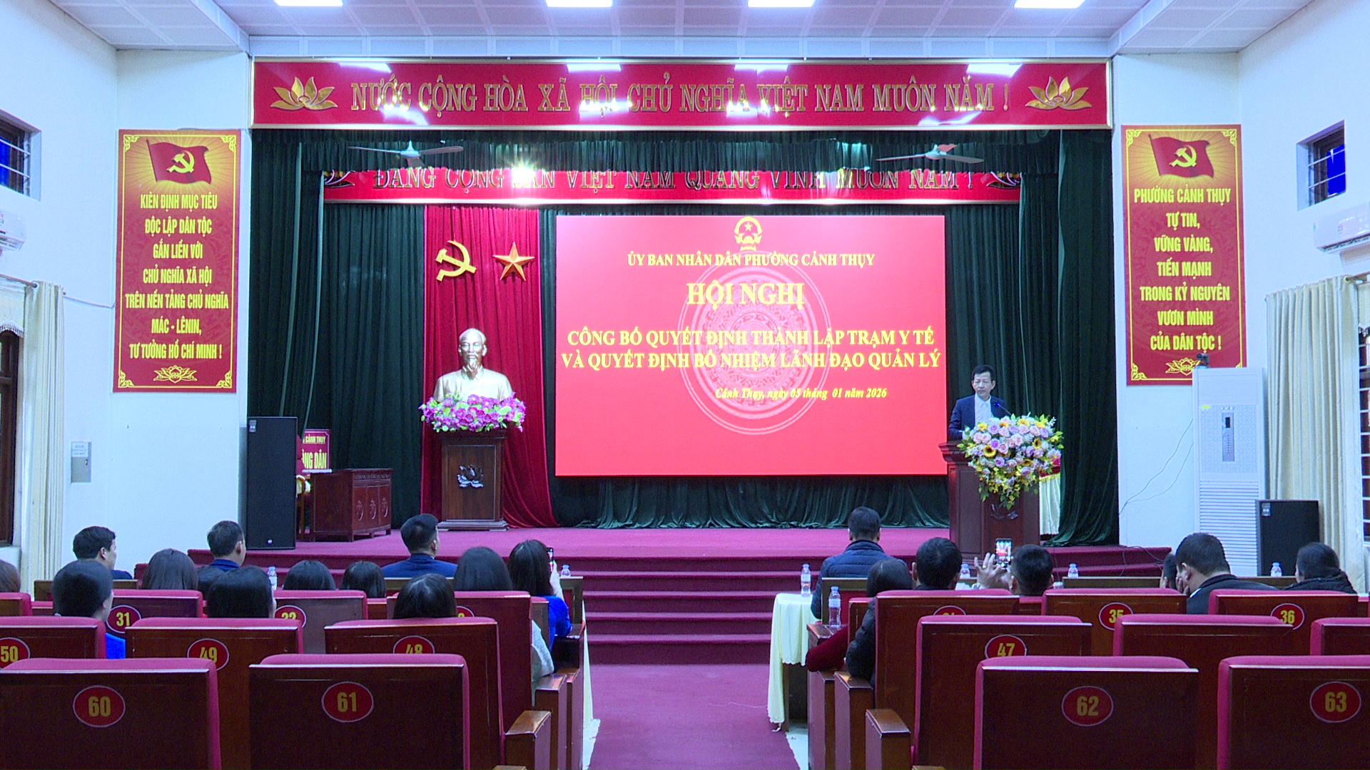 Tại hội nghị, lãnh đạo Phòng Văn hóa- Xã hội công bố Quyết định số 93/QĐ-UBND ngày 31/12/2025 của UBND phường về việc thành lập Trạm Y tế Cảnh Thụy; Công bố quyết định về việc tiếp nhận, điều động viên cức tại Trạm Y tế xã (cũ) và Trung tâm Y tế Bắc Ninh số 1 đến công tác tại Trạm Y tế Cảnh Thụy theo Quyết định số 2358/QĐ-SNV ngày 30/12/2025 của Giám đốc Sở Nội vụ tỉnh Bắc Ninh. Theo Quyết định, Trạm Y tế Cảnh Thụy được thành lập trên cơ sở sắp xếp, tổ chức lại Trạm Y tế Tiến Dũng, Trạm Y tế Cảnh Thụy và Trạm Y tế Tư Mại, chính thức hoạt động từ ngày 01/01/2026.