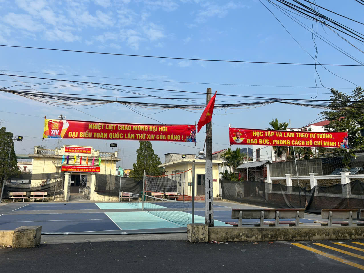Cờ, pano, khẩu hiệu tuyên truyền rực rỡ tại trụ sở Đảng ủy, HĐND, UBND phường (trụ sở ở TDP Huyện)