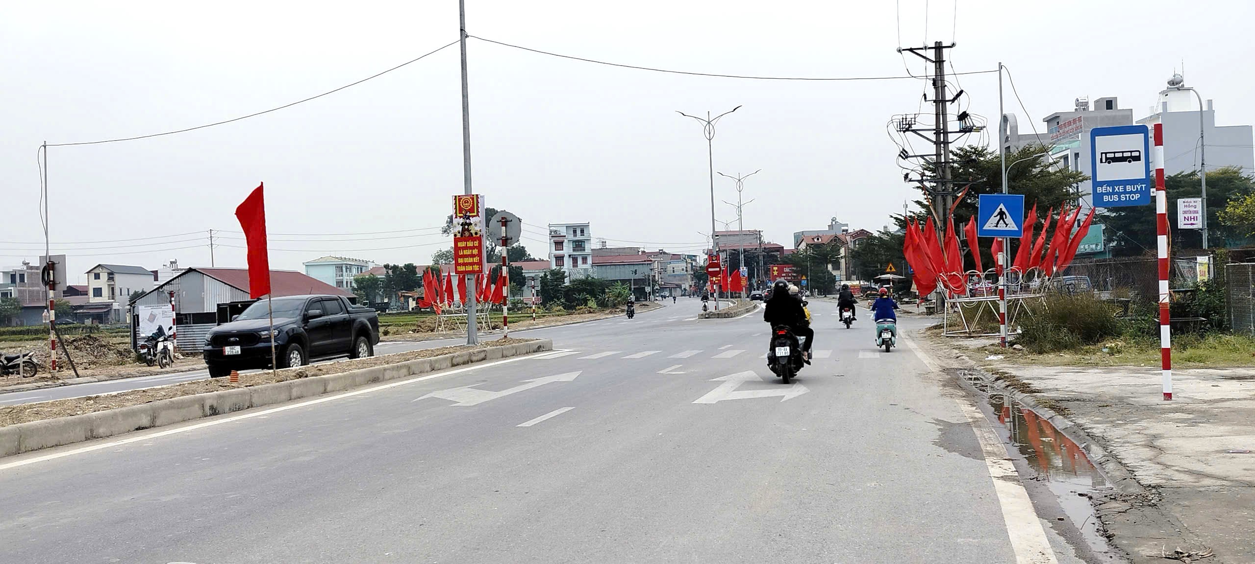 Cờ, pano, khẩu hiệu tuyên truyền rực rỡ tại trục đường chính vào trung tâm phường Cảnh Thụy