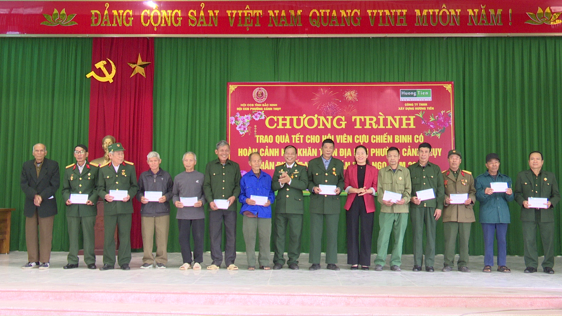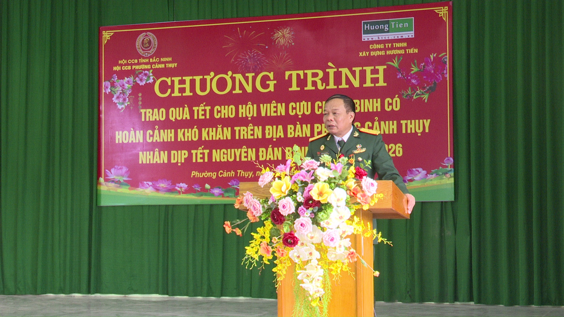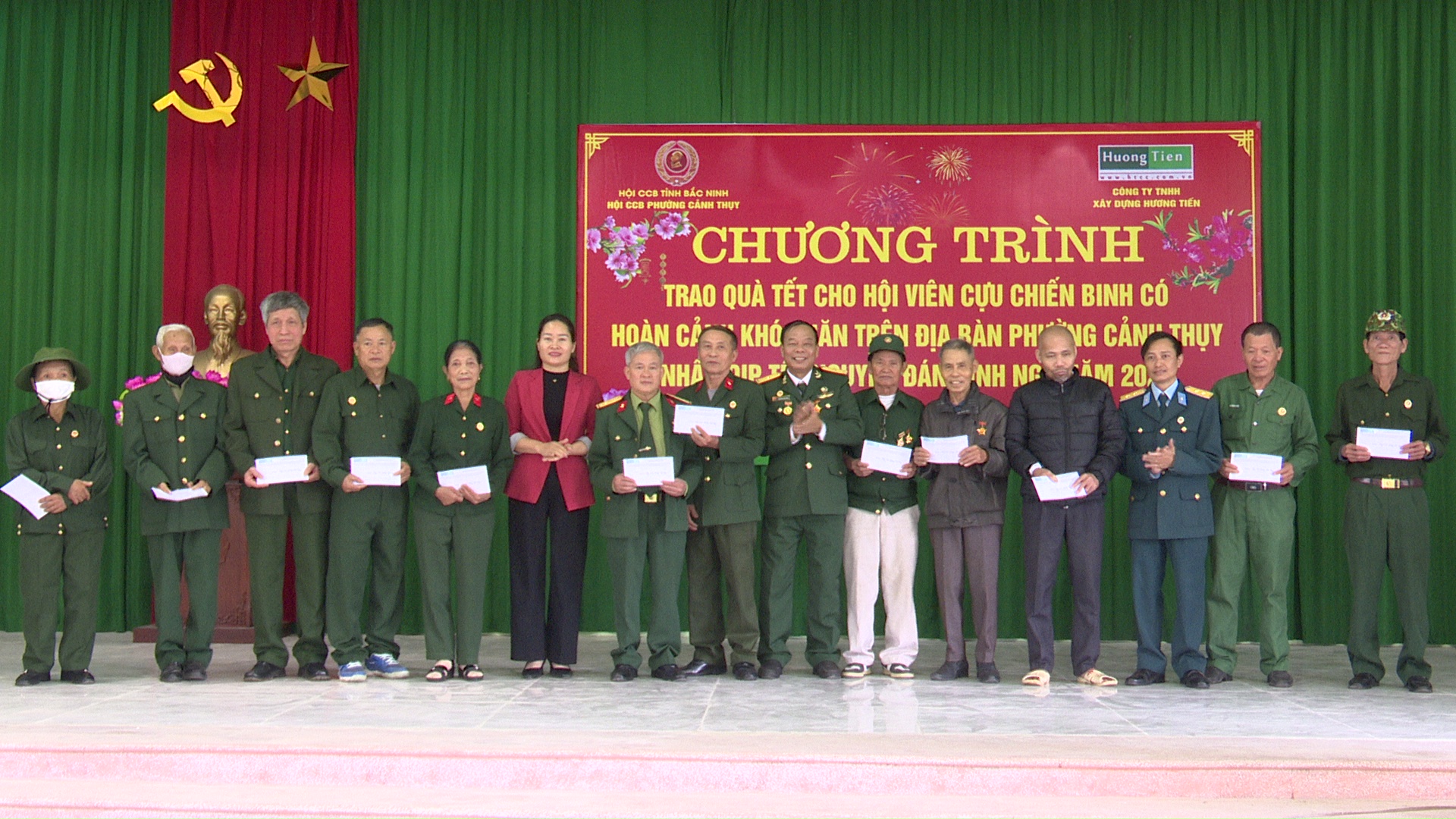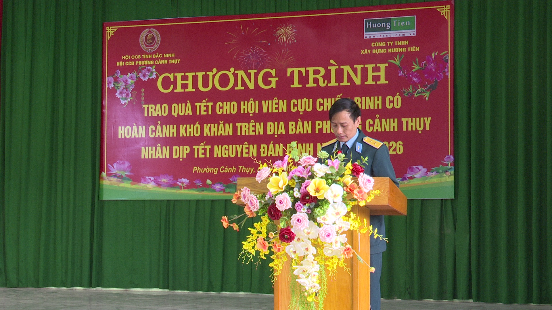 Sáng ngày 30/1, Hội Cựu chiến binh (CCB) phường Cảnh Thụy phối hợp với Công ty TNHH xây dựng Hương Tiến tổ chức Chương trình trao quà tết cho hội viên có hoàn cảnh khó khăn nhân dịp tết Nguyên đán Bính Ngọ năm 2026. Dự chương trình có bà Nguyễn Thị Kiên - Ủy viên BTV Đảng ủy, Chủ tịch Ủy ban MTTQ phường; ông Nguyễn Văn Sơn - Phó Chủ tịch Hội Doanh nghiệp, doanh nhân tỉnh Bắc Ninh, Giám đốc Công ty TNHH xây dựng Hương Tiến.