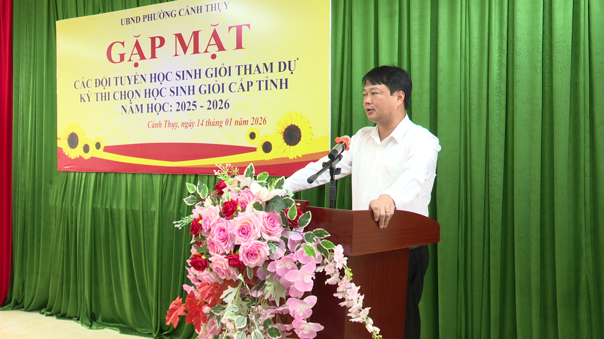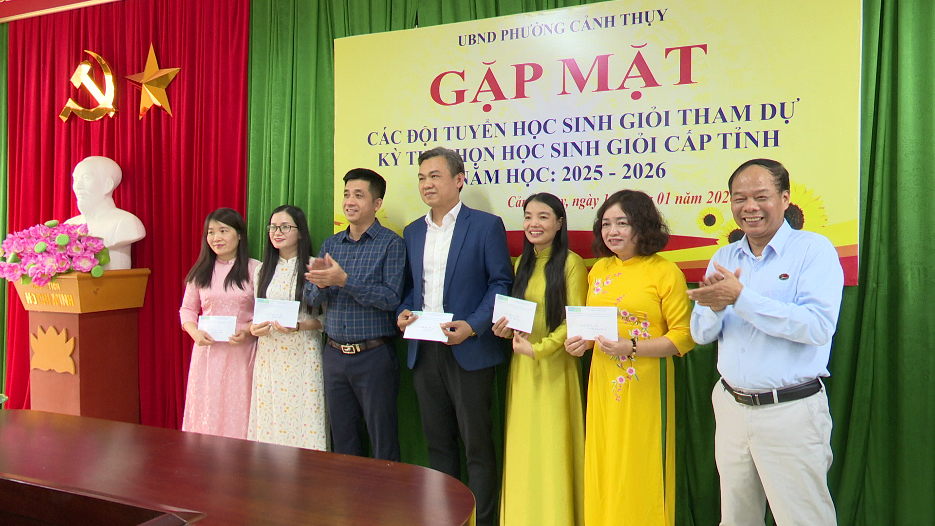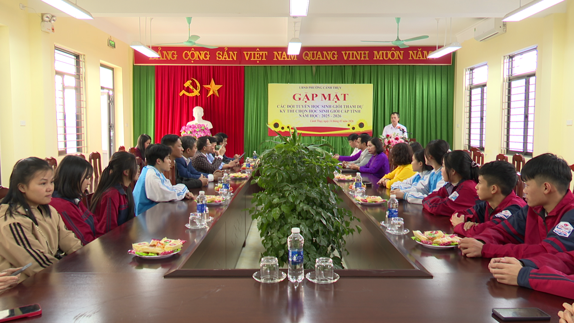 Chiều ngày 14/1, UBND phường Cảnh Thuỵ tổ chức buổi gặp mặt và động viên đội tuyển học sinh giỏi (HSG) các môn văn hoá lớp 9 tham gia kỳ thi chọn học sinh giỏi cấp tỉnh năm học 2025 – 2026. Dự buổi gặp mặt có đồng chí Phan Văn Giang- Phó Bí thư Đảng uỷ, Chủ tịch UBND phường; đồng chí Khổng Minh Tùng – Phó chủ tịch UBND phường.